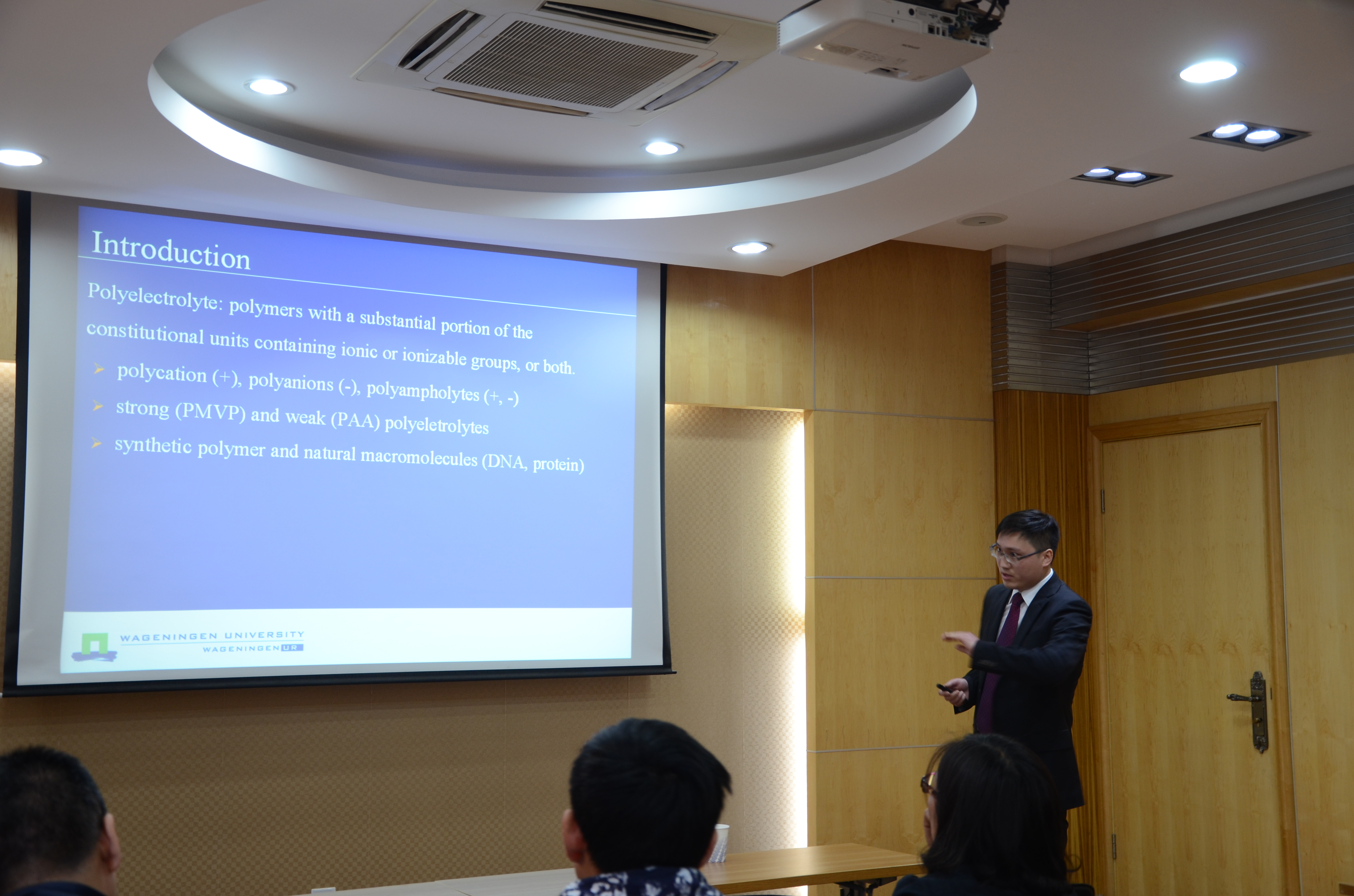 王俊有博士作了题为“Metal Containing Complex Coacervate Core micelles”的学术报告。他给师生们介绍了金属离子配位作用在胶束合成制备的应用。在过渡态金属离子配位胶束的研究基础上,他进一步采用了镧系金属作为中心离子配位作用合成胶束,使得合成的胶束具有更好的稳定性和可调功能性,使得其在治疗和诊断的光学成像领域具有更广阔的应用前景。