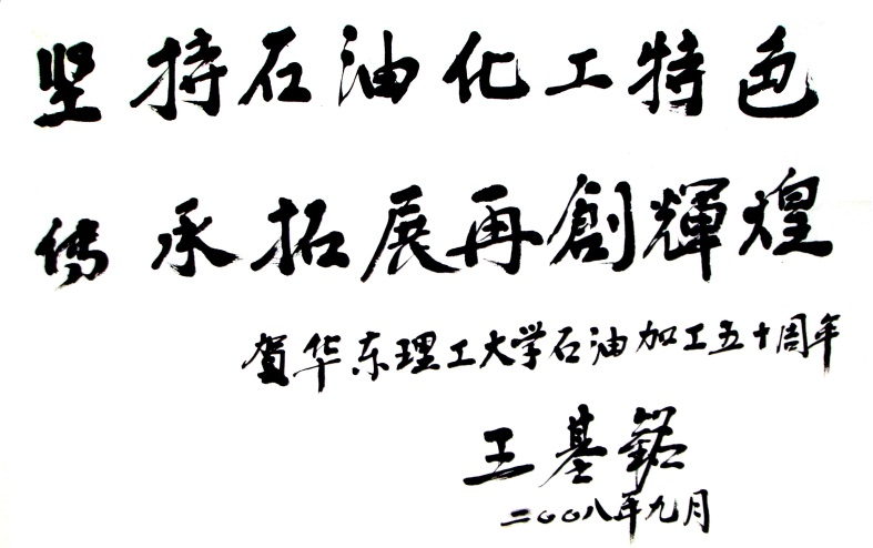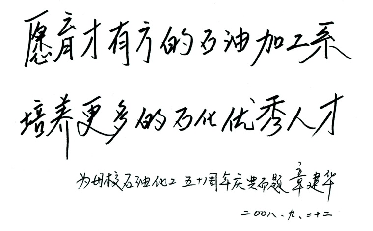 在专业成立五十周年之际,杰出校友章建华教授题词:“愿育才有方的石油加工系培养更多的石化优秀人才”,杰出校友王基铭院士题词:“坚持石油化工特色 传承拓展再创辉煌”。