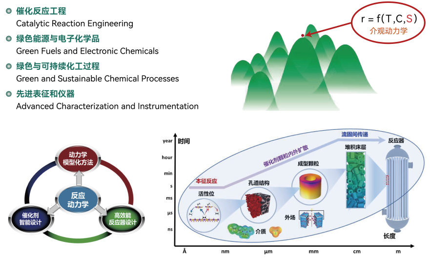 以化学反应工程为研究方向,国际上率先提出了用于工业催化剂和反应器设计开发的介观动力学研究方法,重点突破绿色燃料(绿色甲醇、SAF等)、生物基化学品、大宗化学品(低碳醇、低碳烃等)/劣质资源(劣质芳烃、废塑料等)高值化、电子化学品的短流程、绿色低碳催化反应工程技术。成立华理-复洁绿色能源化工联合实验室,重点突破绿色燃料高端制造技术,助力上海国际航运中心建设;开展国家发改委化工新材料领域技术联合攻关,重点突破含氟半导体电子化学品制造成套技术;成立华理-世名电子化学品联合实验室,重点突破丙烯酸酯类单体、树脂等高效合成与高纯分离技术。
