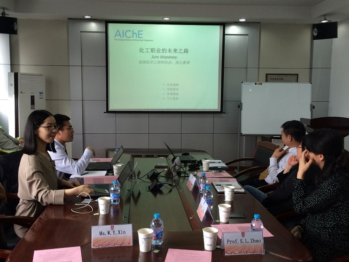 的师资队伍、人才培养、科学研究、国际交流等方面的情况。AIChE企划师Shaw Xiao先生针对AIChE组织的基本情况、教育资源、学术及学生活动等情况进行了详细的介绍,重点强调了AIChE的学生活动对化工人才培养的推动作用、化工职业的未来之路、化工行业的发展遇到的问题和前景。