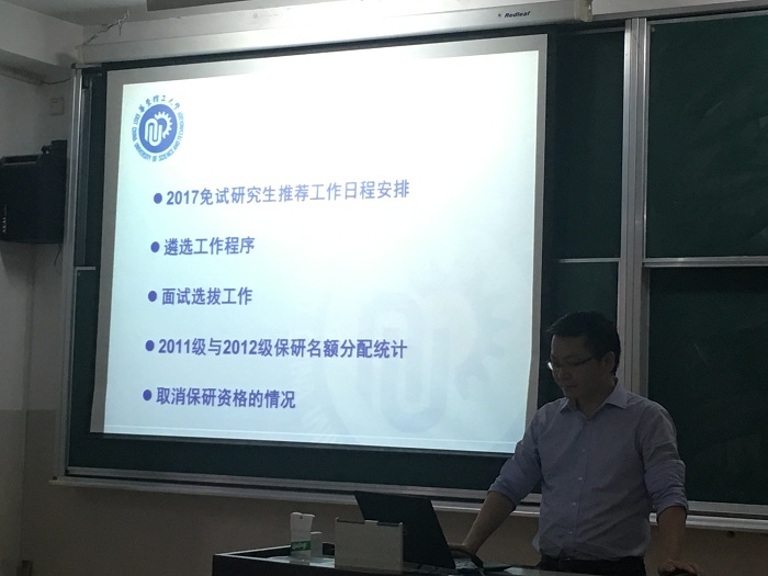 会上,赵双良老师向同学们详细介绍了我院2017年免试研究生推荐政策及本次推免工作的日程安排,并以化工专业为例,介绍了候选人名额以及面试成绩的计算方法等,确保同学们对政策做到充分理解。此外,赵老师着重强调了取消免试推荐资格的多种情况,告诫同学们一定要谨慎对待。