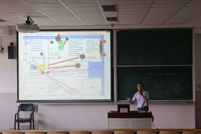 液化空气(中国投资有限公司)实验室气体业务单元总经理刘东亮,公司通用工业技术经理安晓峰,实验室气体业务拓展艾业北等一行八人来到了讲座现场,他们为广大师生带来了一堂精彩的用气安全讲座。