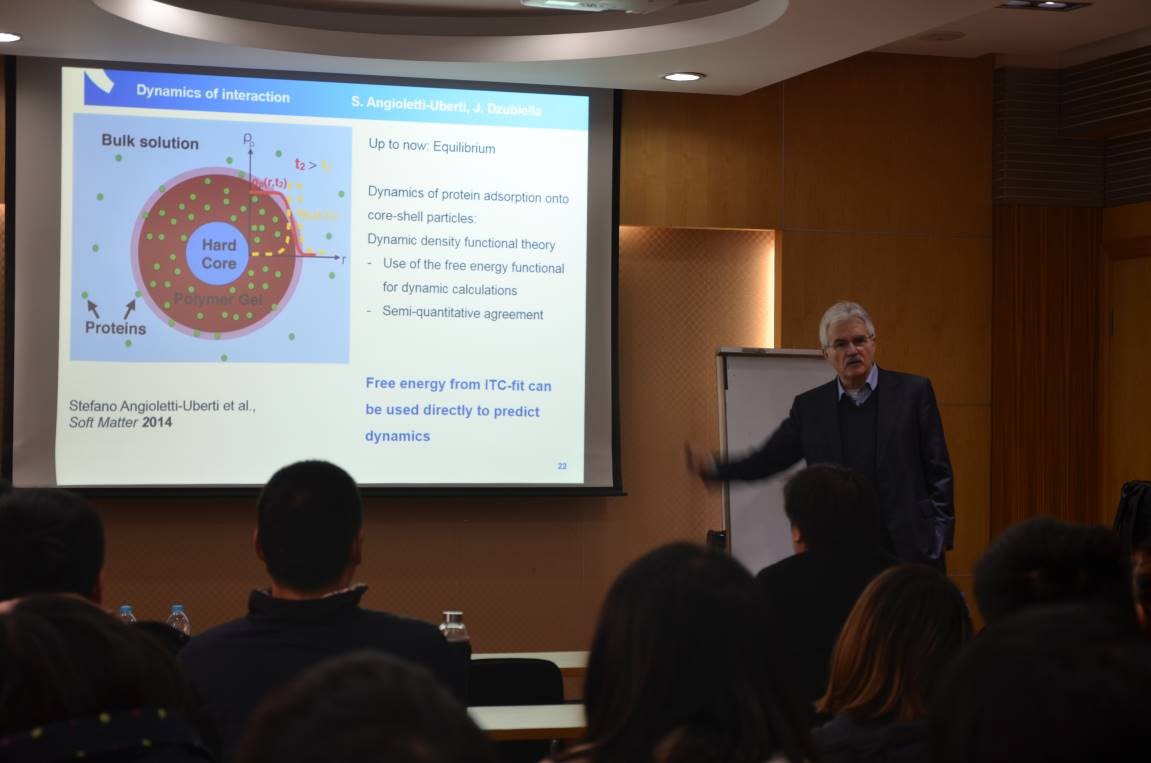 访问。Ballauff教授在实验16楼110为我院师生带来题为“Self-assembly of Proteins with Charged Polymers: Comparing experimental Data to Theory and Simulation”的学术报告(图1)。他的报告主要是关于聚电解质刷与蛋白质的相互作用,通过理论分析和计算机模拟,进一步加深了对其相互作用机理的理解。Ballauff教授丰富的知识和深入浅出的介绍,使 嗨皮漫画