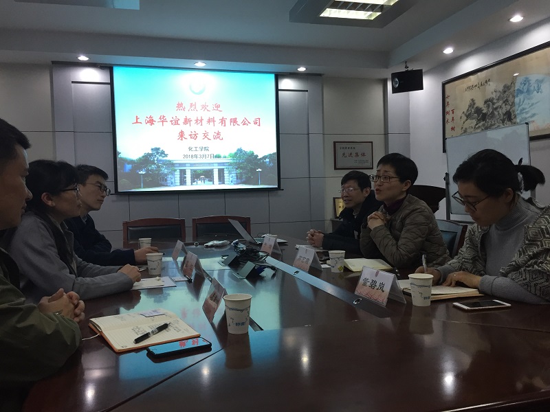 的学生情况。华谊新材料人力资源部总经理瞿红则详细介绍了公司的历史与发展、职业上升通道以及嗨皮漫画,表达了公司对化工学子的需求高度一致,尤其历数了几位优秀的华理校友在公司的成长及贡献。双方还就产学研合作,学生开放日活动、毕业实习等方面展开讨论,为加强双方进一步合作提供新的思路。最后,高艺霞表示企业“安全、创新、务实、合作”的核心价值观与华理“勤奋求实、励志明德”的校训,其有着相似内涵,也是双方一直保持着良好合作的基石;她希望通过合作交流培养出满足社会、企业需求的人才,企业也能为毕业生提供良好的成长舞台。