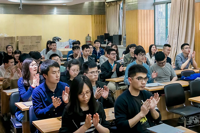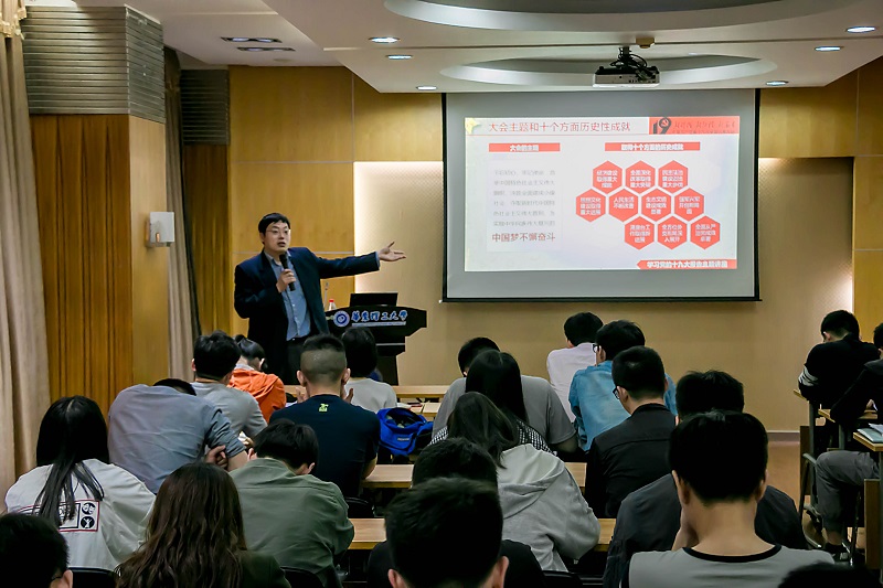 朱学栋以党的十九大报告及会议的重大意义为主线,以分析党的执政能力、治国方针、发展战略、当前国际形势为重点,深入地阐述了习近平新时代中国特色社会主义思想以及当代大学生的社会责任与使命。他还引入了很多社会热点话题,例如上海房价、中国制造、中美贸易战、中国产业结构等实际问题,生动形象地解释了党执政的优越性、制定的社会主义目标的现实依据以及社会主要矛盾发生改变的根本原因。这让同学们快速准确地理解了一些比较抽象的词条和概念。
