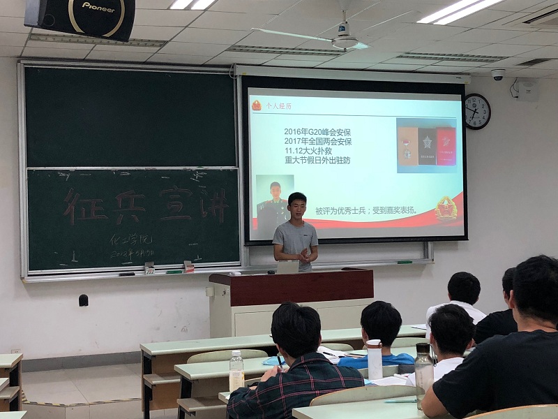 学工委在2018年5月15日晚6:00于教学楼D306教室举办了一场别开生面的征兵动员宣讲会。宣讲会由2016级辅导员强莉主持,宣讲嘉宾为 嗨皮漫画