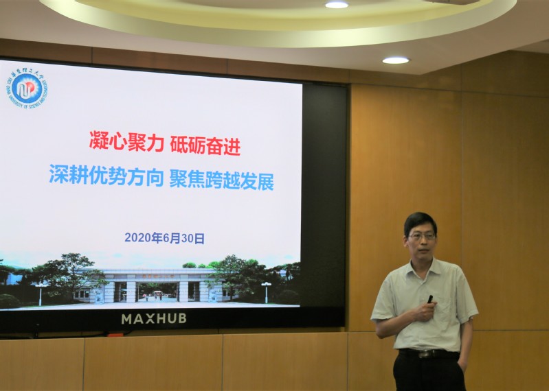 化工学科的基本情况,汇报了学院“十三五”科研工作总结、2020年科研重点工作和“十四五”重点发展规划。汇报中,他提出要加快做好学院“十四五”科技创新规划,明确提出了 “十四五”时期学院科技创新的总体思路、发展目标、主要任务和重点工作。学科建设围绕高效分离与反应工程、材料化工与产品工程、智能与仿生化工三个学术方向,重点支持发展高端专用化学品、关键化工新材料、新能源器件与装备等领域;紧密对接国家重大需求,持续促进人才培养,凝聚优势科研成果,全面提升学院的社会服务能力。
