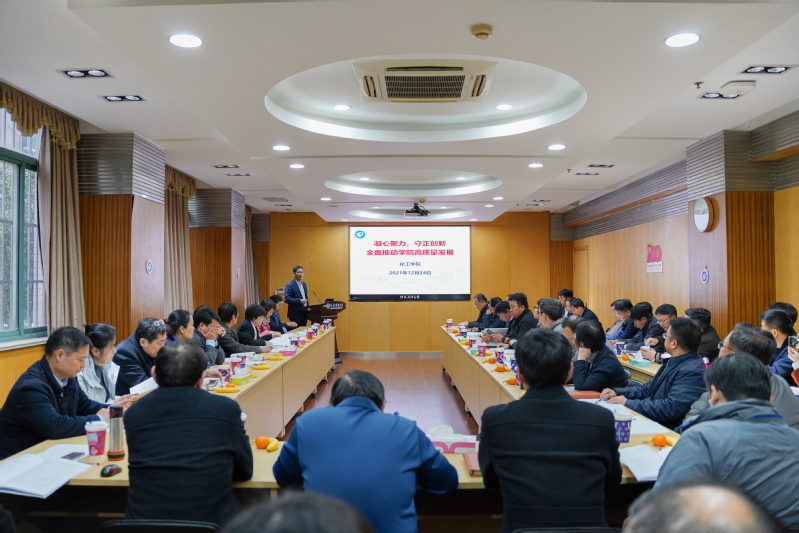 院长李春忠作了题为“凝心聚力,守正创新,全面推动学院高质量发展”的工作汇报。他立足学院发展现状,着重汇报了学院近三年来在立德树人、学科发展、师资队伍建设、科学研究、社会服务等中心工作中的创新举措、建设成效和存在的问题。他指出,要准确理解和把握“十四五”规划的核心要义,以“双一流”学科建设为契机,坚持立德树人、深耕内涵发展,力争在重要指标实现“倍增”。要深入阐述交叉与融合背景下化工学科建设的新动向、新问题及新举措,传统方向加强基础研究,新兴方向强化工程特色,实现基础研究与工程应用相融合,赓续传承学院优势与特色;要引育并重,打造具有国际影响力的教学和科研创新团队,提升承担国家重大项目的能力,培育更多的重大教学科研成果;要加强课程体系和教材体系等建设,根据学科发展和国家重大战略需求布局专业和学位点,着力培养符合国家需要、推动科技进步、引领社会发展、适应国际竞争的新时代化工人才;要扎实推进“跃升计划2.0”“卓越计划”“育英计划”等重点工作提质增效,全面推动学院工作再上新台阶。
