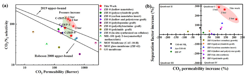 图片说明:配体旋转锚定前后ZIF-8的CO2/N2吸附和膜分离性能对比