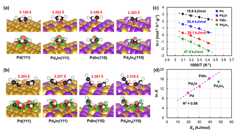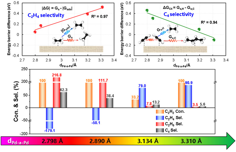 设计活性位点分布均匀、距离精确可控的催化剂,以匹配目标反应路径中关键物种的构型,在原子尺度上实现对复杂反应路径的定向调控,是多相催化领域长期以来追求的目标。以乙炔选择性加氢为例,研究团队基于前期研究基础 (Angew. Chem. Int. Ed. 2020, 59, 11647; Nat. Commun. 2022, 13, 5534),以具有不同相邻Pd位点间距离(dPd-a-Pd)特征的Pd-In金属间化合物作为模型,通过理论计算揭示了相邻Pd位点间距离可以很好地描述目标产物乙烯与副产物C4生成两种竞争反应。延长相邻Pd位点间距离有利于促进乙烯脱附并导致C2H3*偶联的过渡态失稳,从而促进乙烯生成并抑制C4生成。