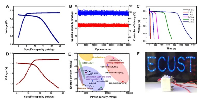 以孔径为3 nm的碳纳米管作为储氯电极,其可以提供 39 mAh/g的比容量,循环55000次后,仍能保持98%的比容量。以其作为正极,NaTi2(PO4)3为负极的超级电容器在 257 C的倍率下可以提供33 Wh/kg的能量密度,30000次循环后,容量几乎没有衰减。而且其在50000 W/kg的高功率密度下仍然可以提供16 Wh/kg的能量密度。此外,应用金属锌作为负极时,该氯超级电容器的能量密度可进一步提高至53 Wh/kg。这些性能远优于目前商业化超级电容器。