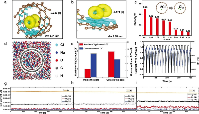 研究结果显示孔径是氯气在多孔碳材料中析出与吸附的关键参数。DFT计算结果表明,在氯离子氧化过程中,氯气的形成能随着孔径的增加而减小,当孔径大于2.03 nm时几乎相同。这也与电化学测试结果一致。孔径为3 nm的碳纳米管,其氯气析出与吸附性能远优于孔径小于2 nm的活性炭衍生物多孔碳,以及孔径约为4 nm的有序介孔碳材料(CMK3)。