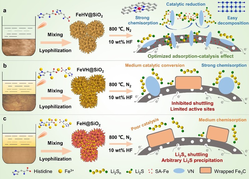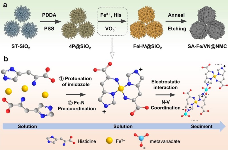 对此,研究团队报道了一种独特的Fe-N-V预配位结构,从而调控液相前驱体中游离Fe3+的含量,成功构筑了单原子Fe-N4和超细VN纳米粒子修饰的氮掺杂多孔“海胆状”空心碳纳米球。