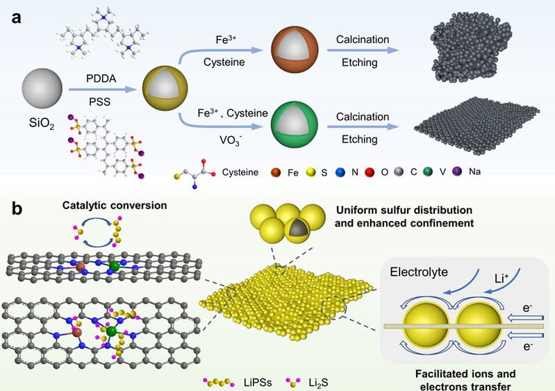 功能炭材料团队在锂硫电池原子级电催化剂的设计和调控研究方面取得新进展,相关成果以“Vanadium as auxiliary for Fe-V dual-atom electrocatalyst in lithium-sulfur batteries: ‘3D in 2D’ morphology inducer and coordination structure regulator”为题发表在ACS Nano上。