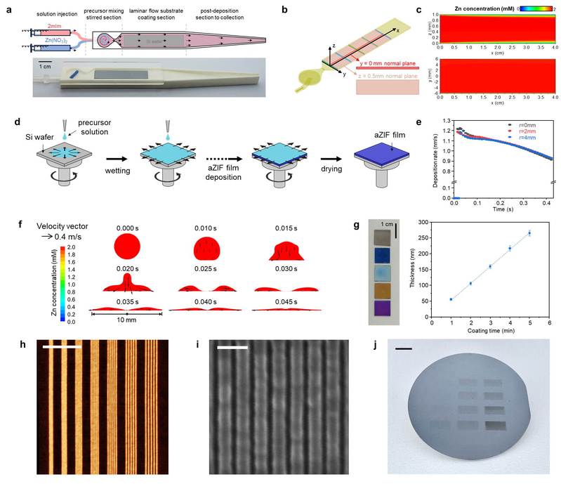 基于前期超稀释前驱体溶液赋能化学液相沉积法制备aZIF薄膜的策略(Nature Materials, 2023),研究团队提出了一种间歇性旋涂化学液相沉积制备aZIF薄膜的方法,实现了可控的薄膜沉积速率和厚度(几纳米到几百纳米)。为了量化流体力学、传递现象、薄膜沉积动力学耦合中复杂的工艺参数对薄膜沉积的影响,从而指导大尺寸基底(8/12英寸晶圆)光刻胶的均匀可控涂覆。研究团队首先通过3D打印的微搅拌连续流反应器,结合薄膜沉积实验、传递现象分析和计算流体力学模拟,得到了薄膜沉积的本征速率,然后根据旋涂实验和仿真结果验证了薄膜沉积动力学,最终揭示了薄膜沉积均匀性的关键影响因素。